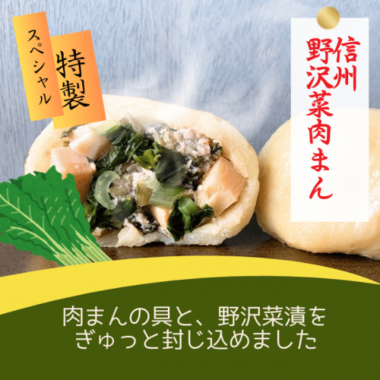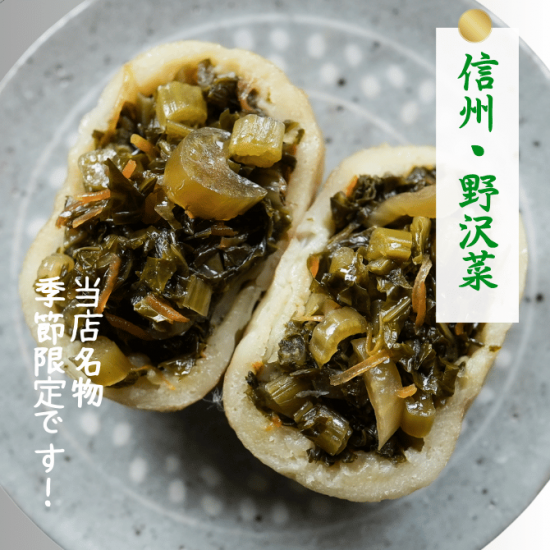 この野沢菜肉まんおやきは、ほり川のおばあちゃんが育てた野沢菜を塩漬けし、