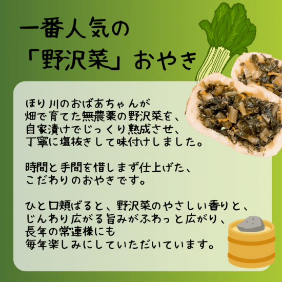 この野沢菜肉まんおやきは、ほり川のおばあちゃんが育てた野沢菜を塩漬けし、